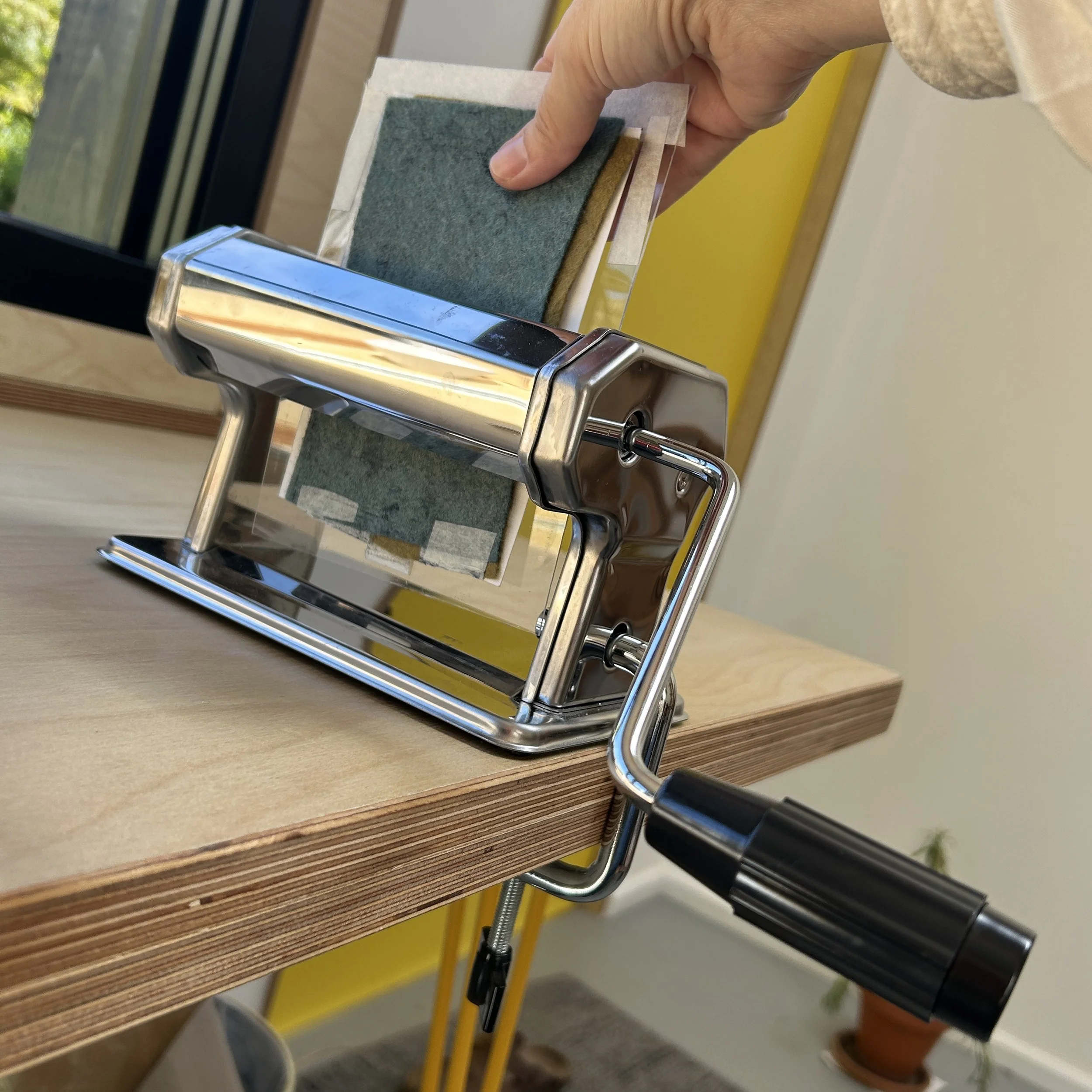 Place your damp paper on top of the inked up plate, and make a blanket with a couple of pieces of felt. This helps to cushion the print and distribute pressure evenly across your image. I attached the felt to the perspex bed using masking tape. Finally pass the print through your pasta maker, be careful that the perspex doesn’t splinter. Experiment with the settings on the side of your pasta maker, so the correct amount of pressure is applied.