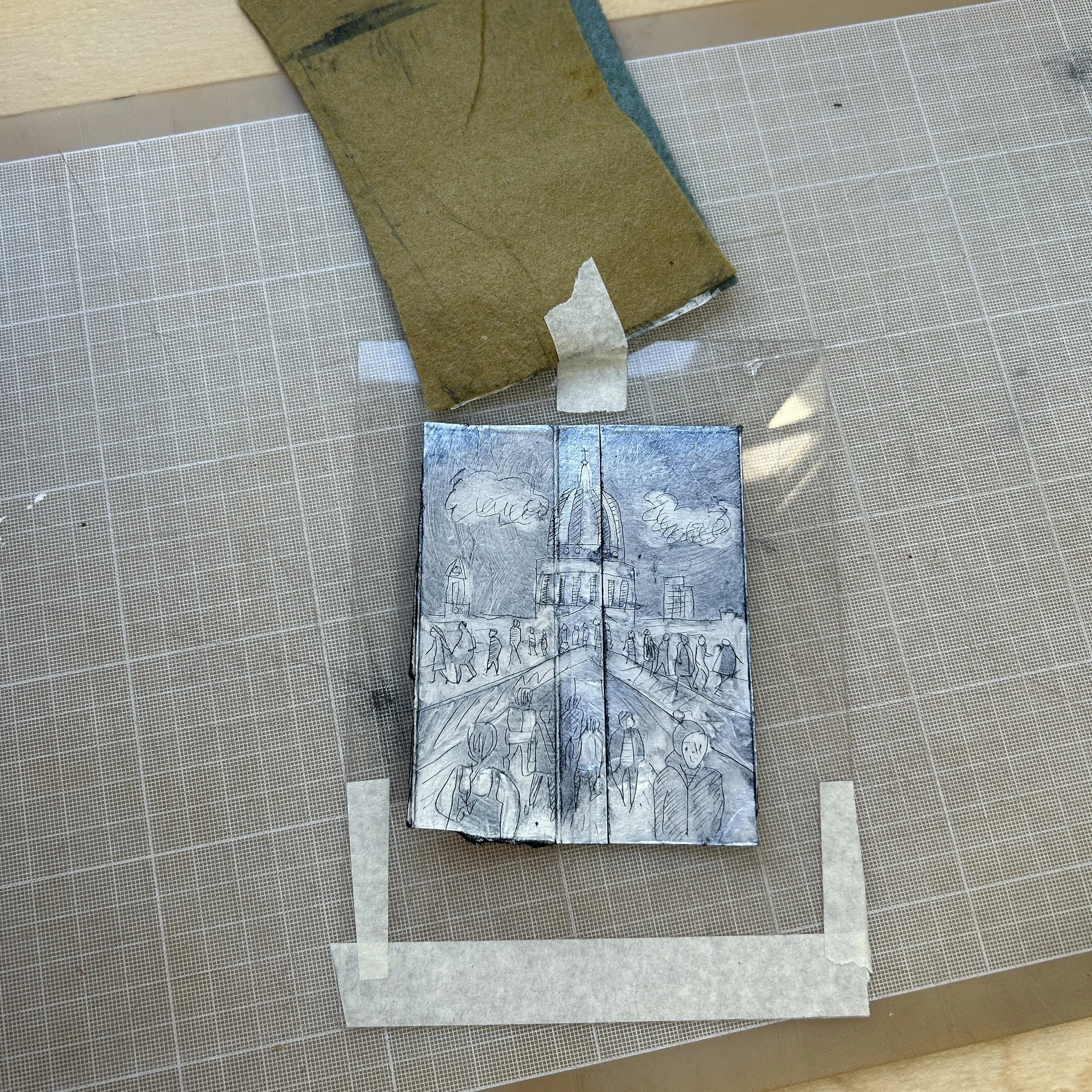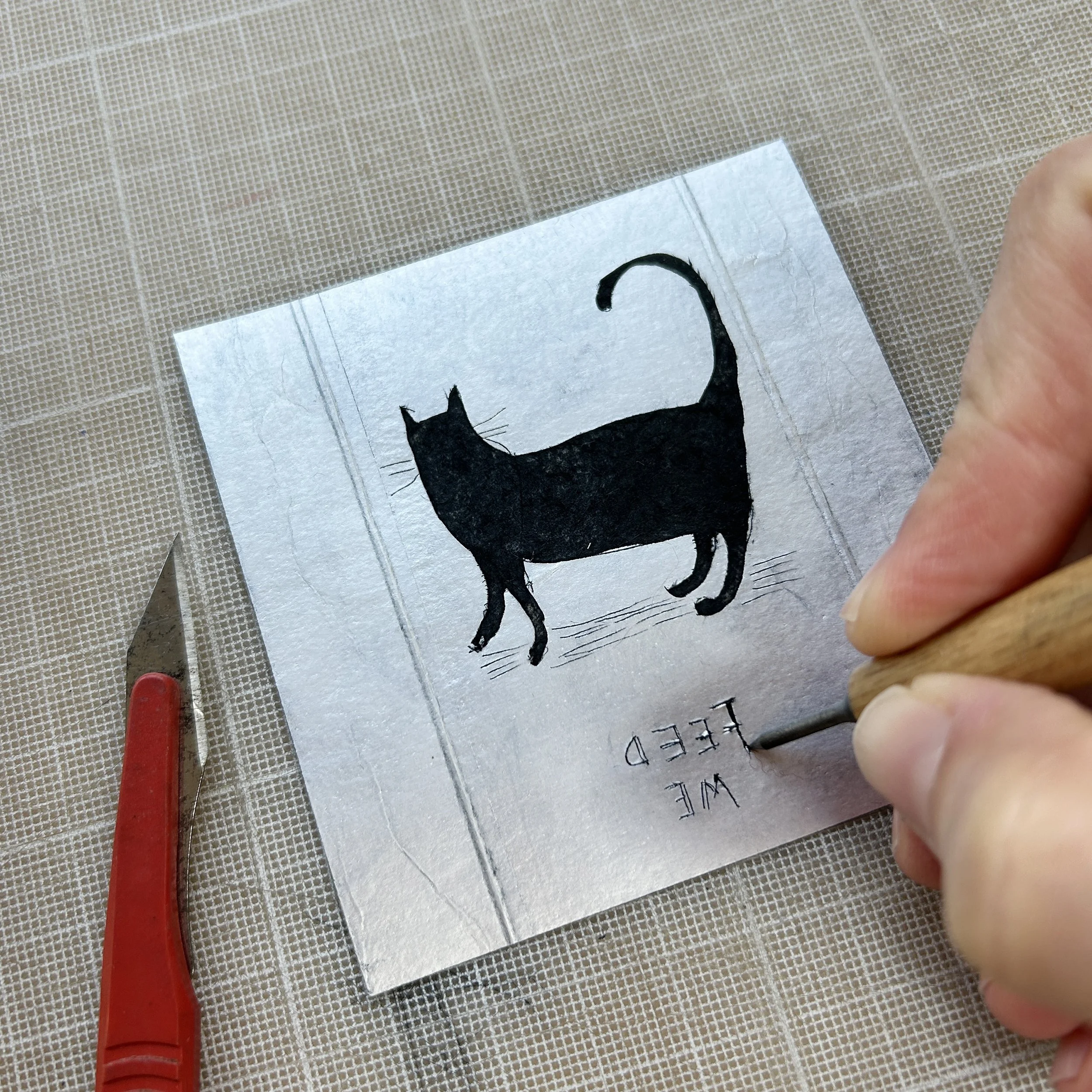 I transferred drawings from my sketchbooks, using tracing paper, onto the card and scratched the images into the cardboard with a sharp etching needle. I also used a scalpel to help me carefully remove larger areas of the metallic surface- such as the cat’s body in the image above.