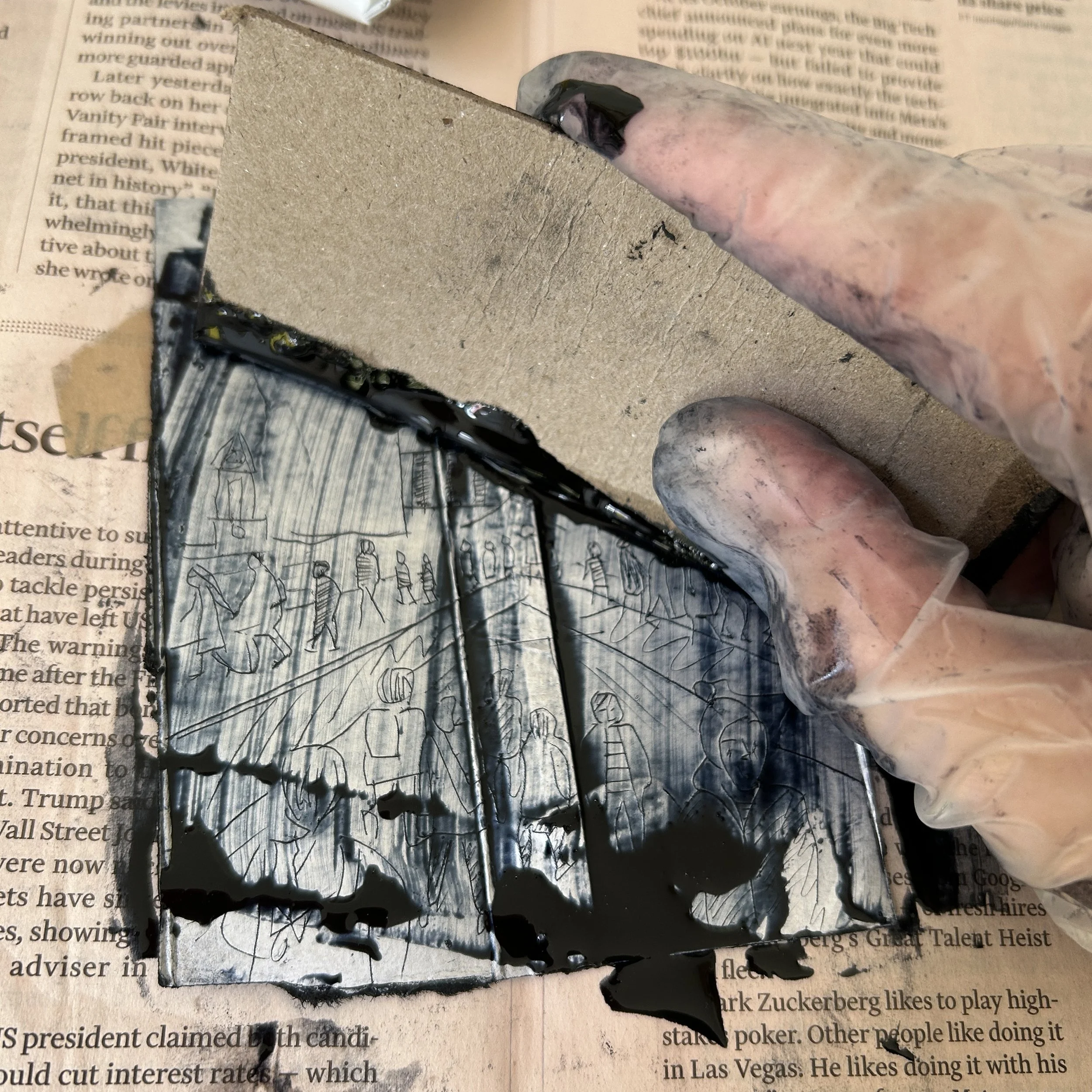 Scraping the ink into the groves using a piece of cardboard - this is messy- wear latex gloves if you don’t want to get dirty.