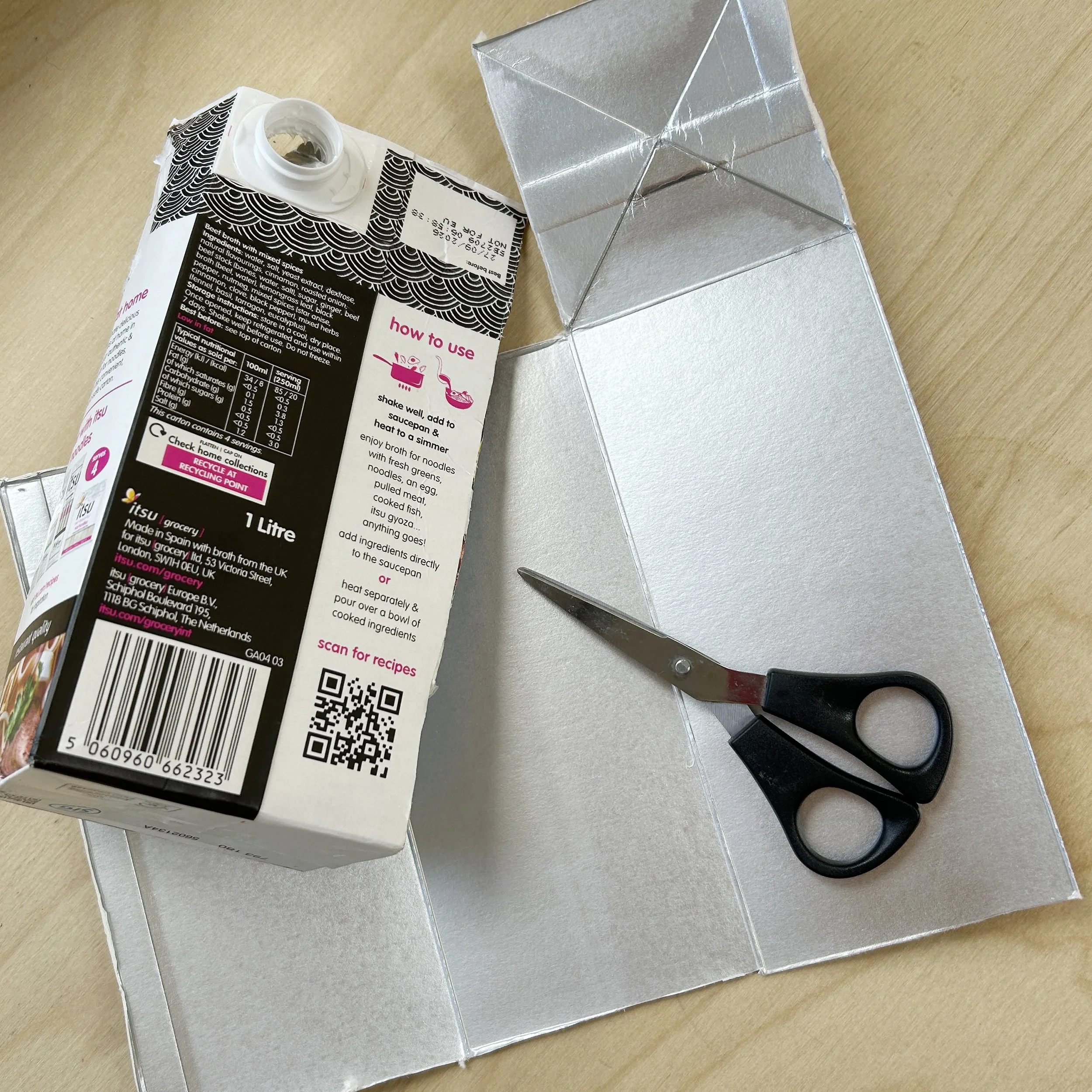 Clean the Tetra Paks before use and then cut them up to create your plates. You’ll be using the inside of the carton, with the shiny, metallic surface, to etch your design onto. Try experimenting with the folds in the cardboard to create creases or textures in your images.