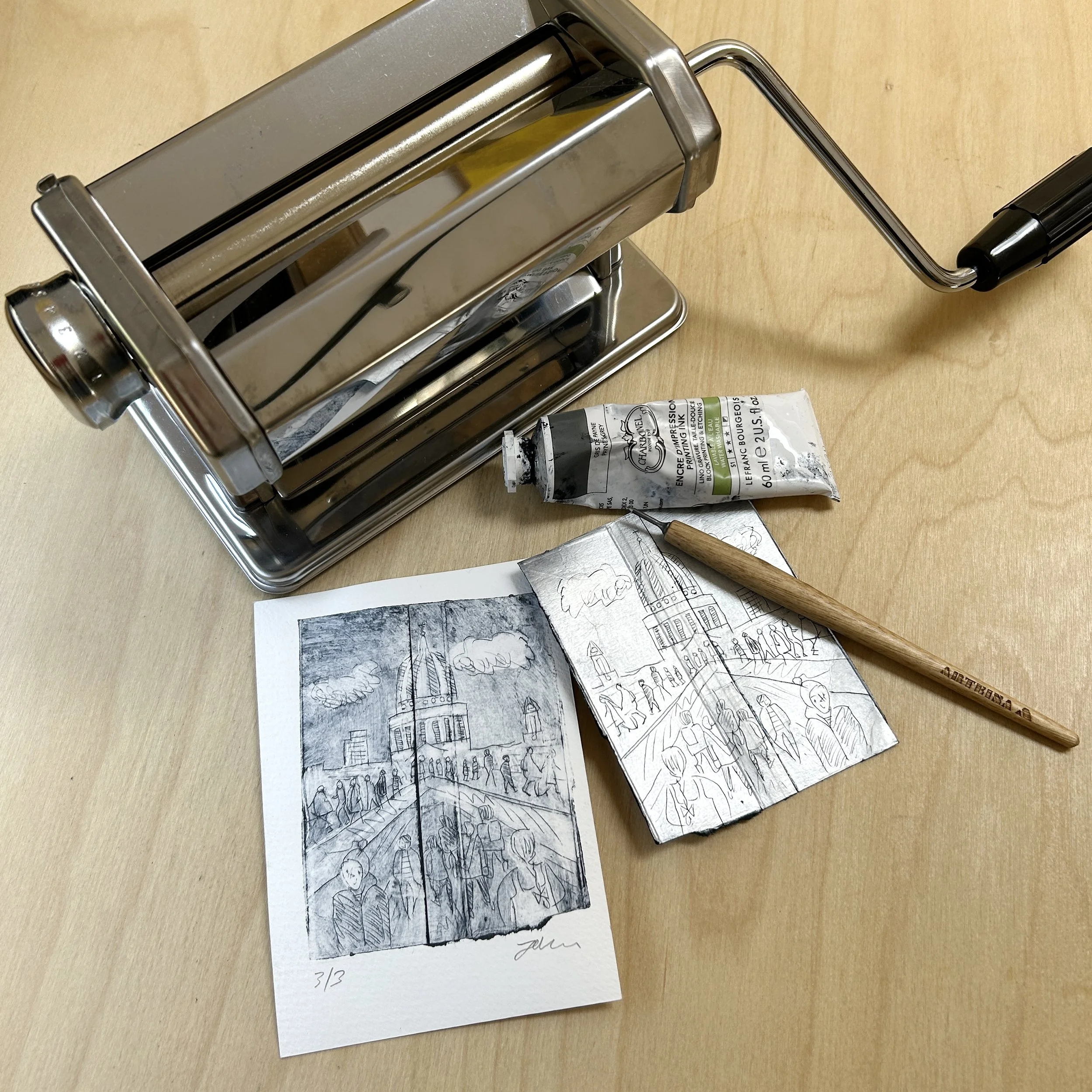 Pasta maker, etching ink, etching needle, cardboard plate and print